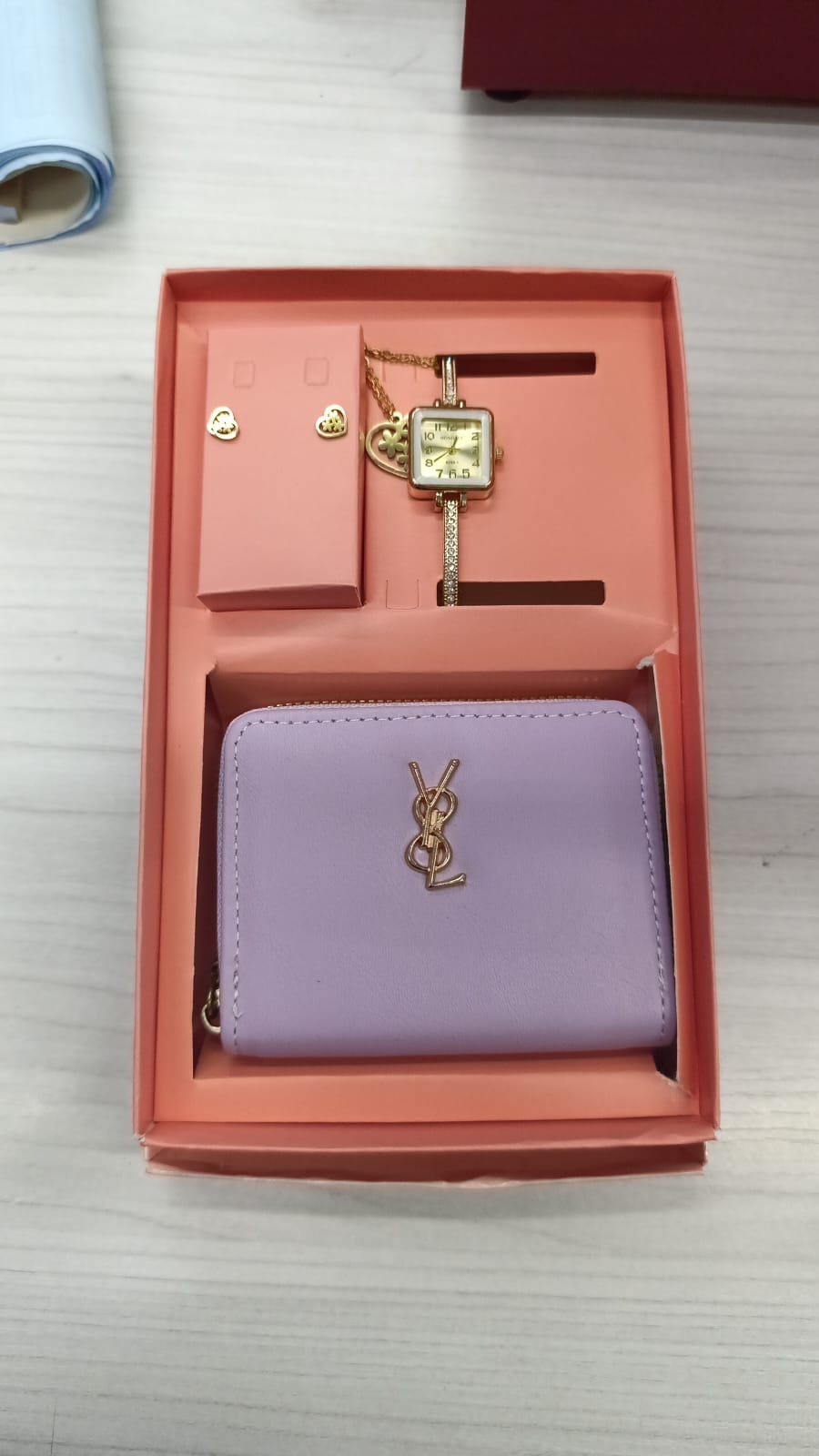 - Contenido: Cartera compacta, reloj clásico y set de joyería minimalista