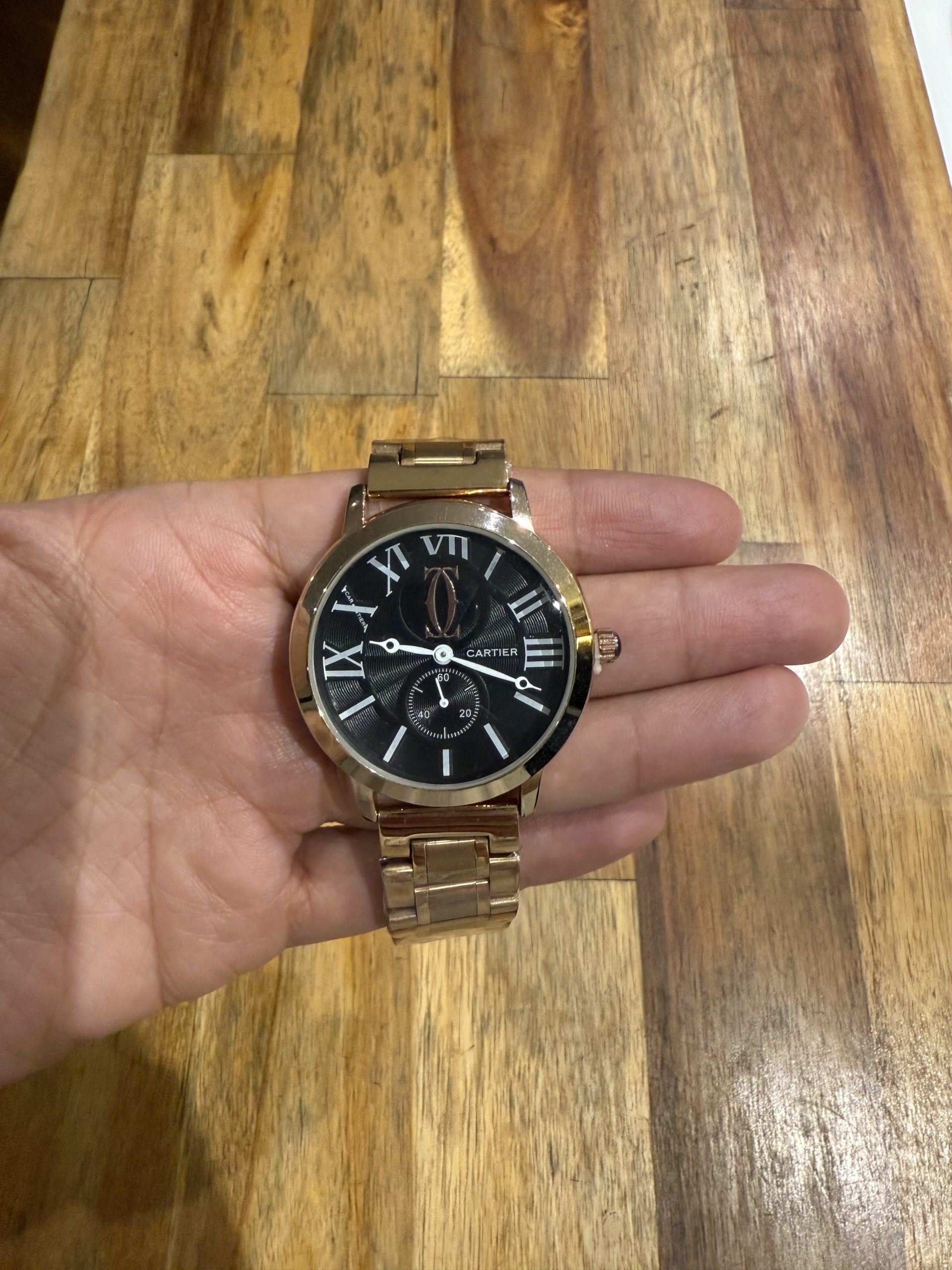 Presenta un diseño llamativo que combina una caja y brazalete en tono dorado con una esfera negra de alto contraste. Se distingue por sus grandes números romanos blancos y un prominente logotipo de la «doble C» de Cartier a las 12, acompañado de una subesfera inferior que le da un toque deportivo a su estilo clásico.