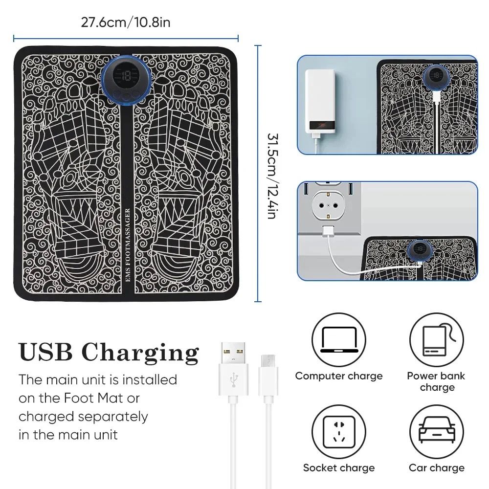 ALIVIO Y COMFORT El Masajeador de Pies Eléctrico EMS mejora la circulación sanguínea en las piernas de los pies y reduce la debilidad muscular de las piernas. ¡Relájate a donde vayas! El masajeador de pies es liviano, plegable y recargable y es fácil de llevar a cualquier parte.
