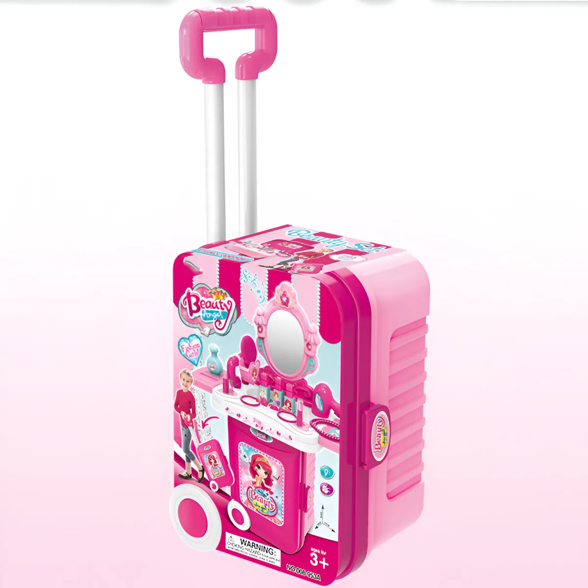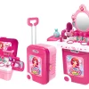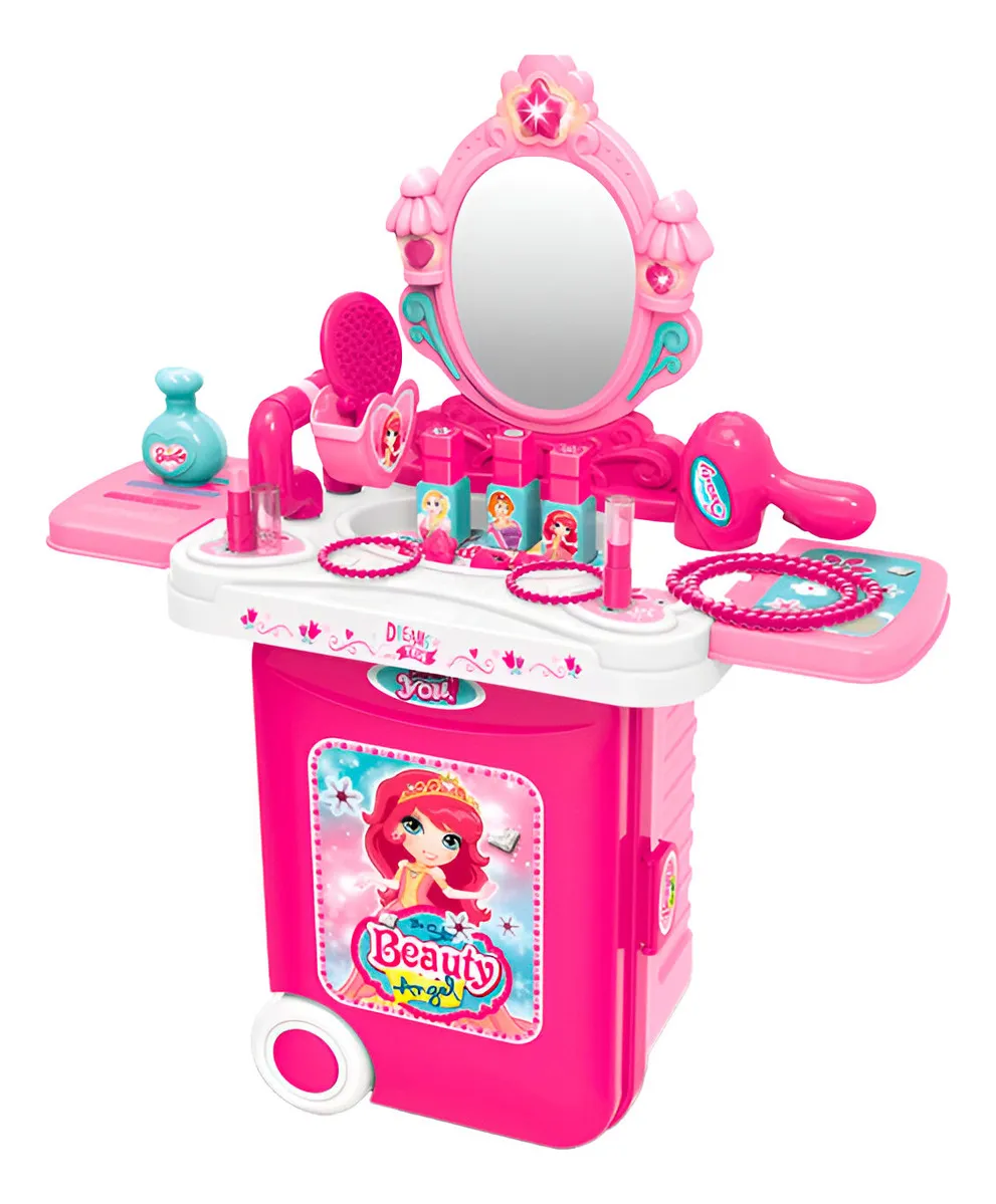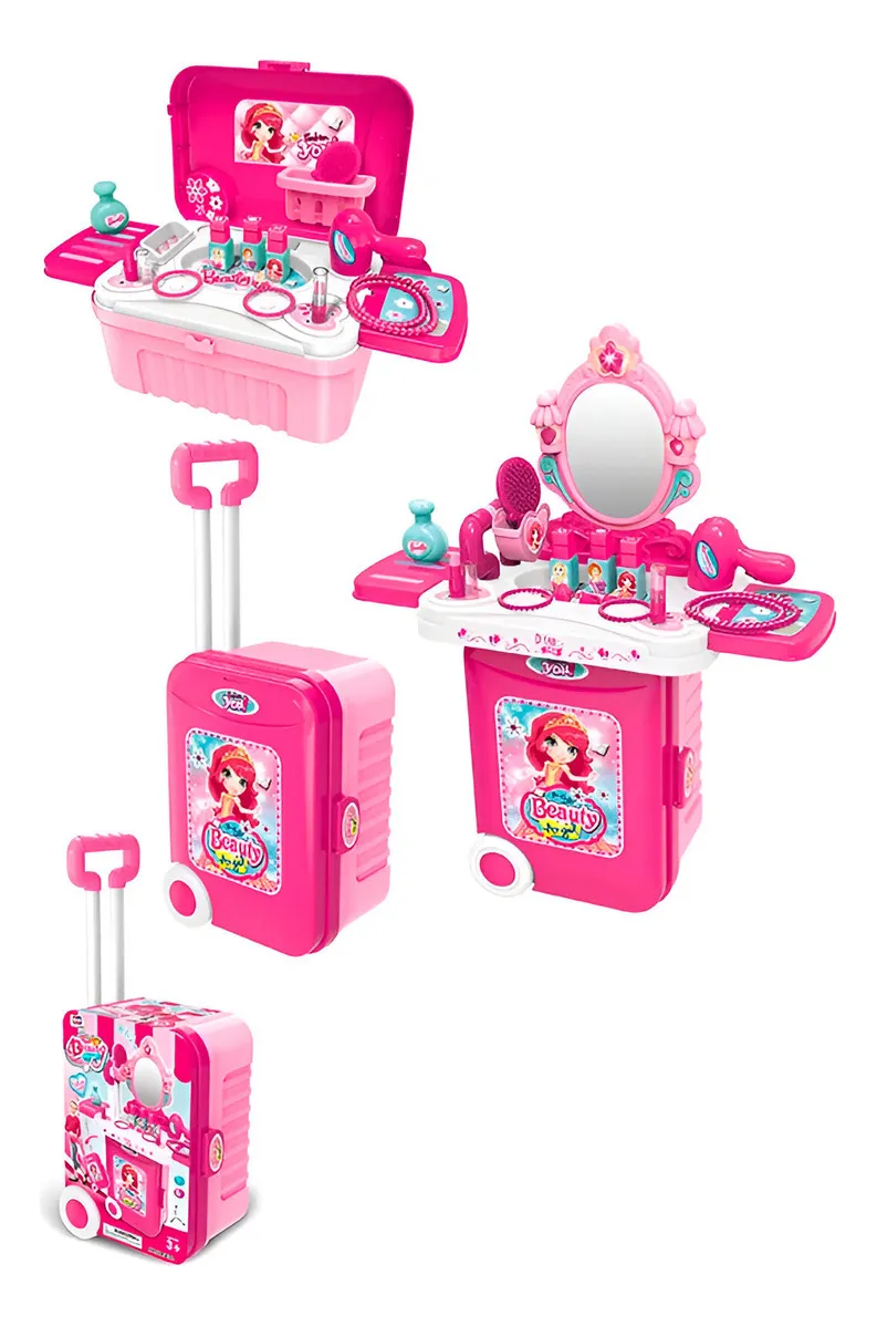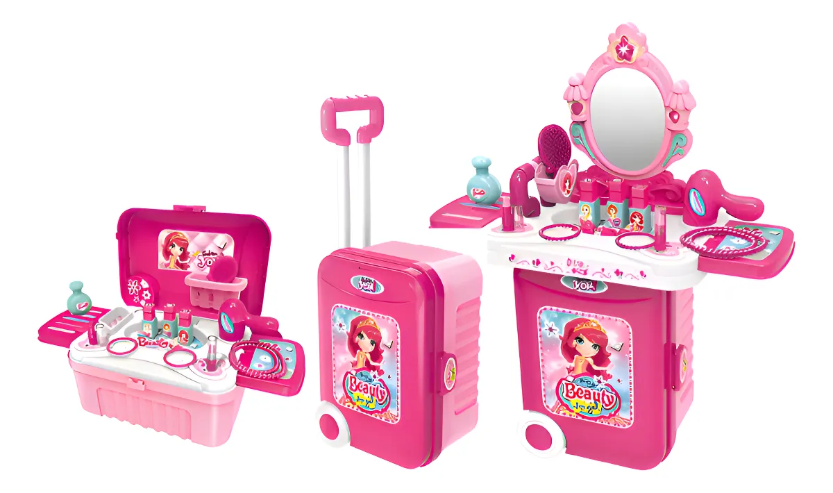 Este encantador set de juego de belleza para niñas combina diversión y portabilidad, ya que se transforma fácilmente de una maleta con ruedas en un completo tocador con espejo y múltiples accesorios. Incluye elementos como secador, cepillo, frascos de perfume, pulseras, labiales y otros utensilios para el juego de imitación, fomentando la creatividad, la imaginación y el juego de roles.