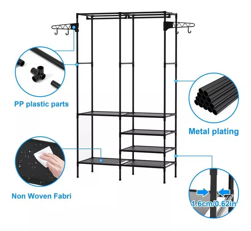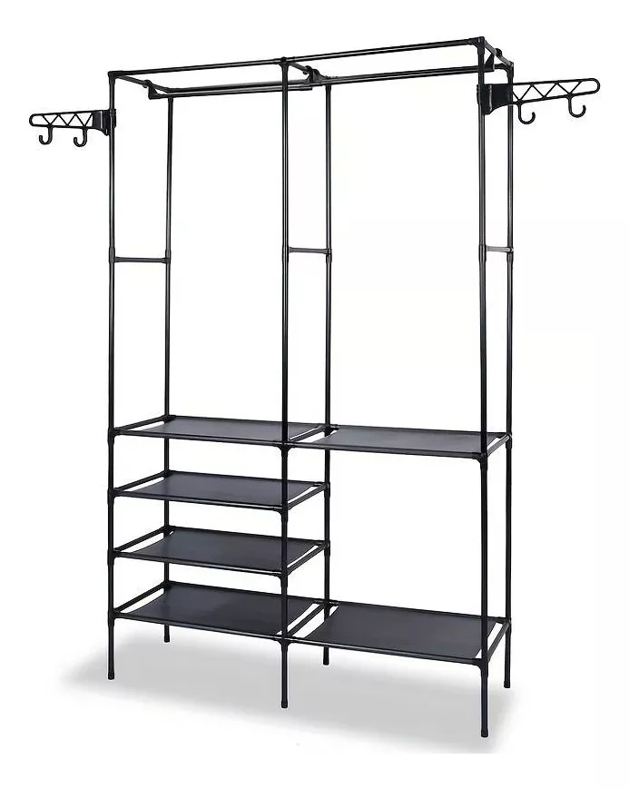 Su multifuncionalidad es una verdadera revolución: disfruta de un perchero superior para tu ropa, ganchos laterales para accesorios y 4 compartimentos inferiores ideales para zapatos y cajas. Hecho de tubo de acero de alta calidad, este organizador es extremadamente resistente y duradero, soportando el peso de tus prendas sin deformarse.