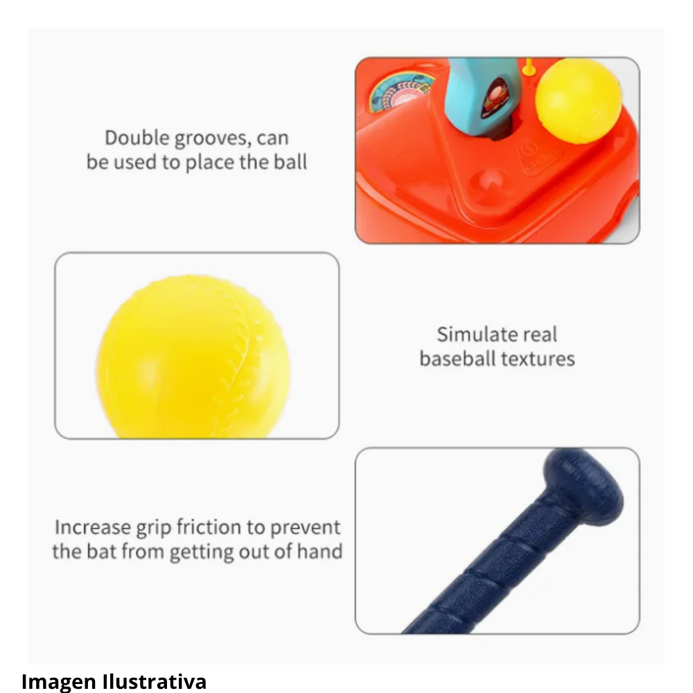 Incluye accesorios de plastico ligero y resistente, adaptados al tamano de las manos de los ninos, como un bate, un palo de golf, pelotas y una base de apoyo. Los colores vivos y las piezas de gran tamano facilitan el reconocimiento visual y el manejo seguro durante el juego.