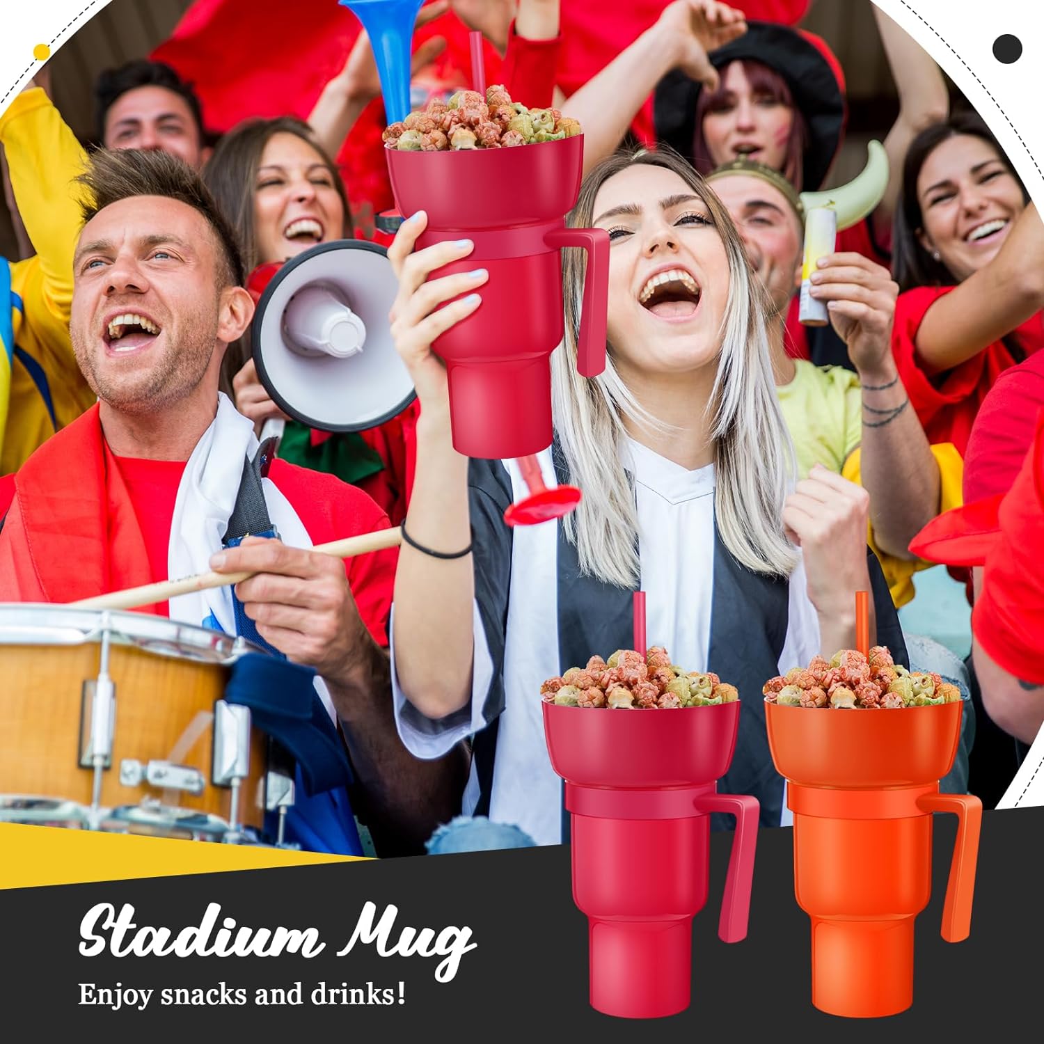 Disfruta de tus aperitivos y bebidas favoritos con el Vaso de Estadio 2 en 1, una ingeniosa combinación de taza y tazón para bocadillos.